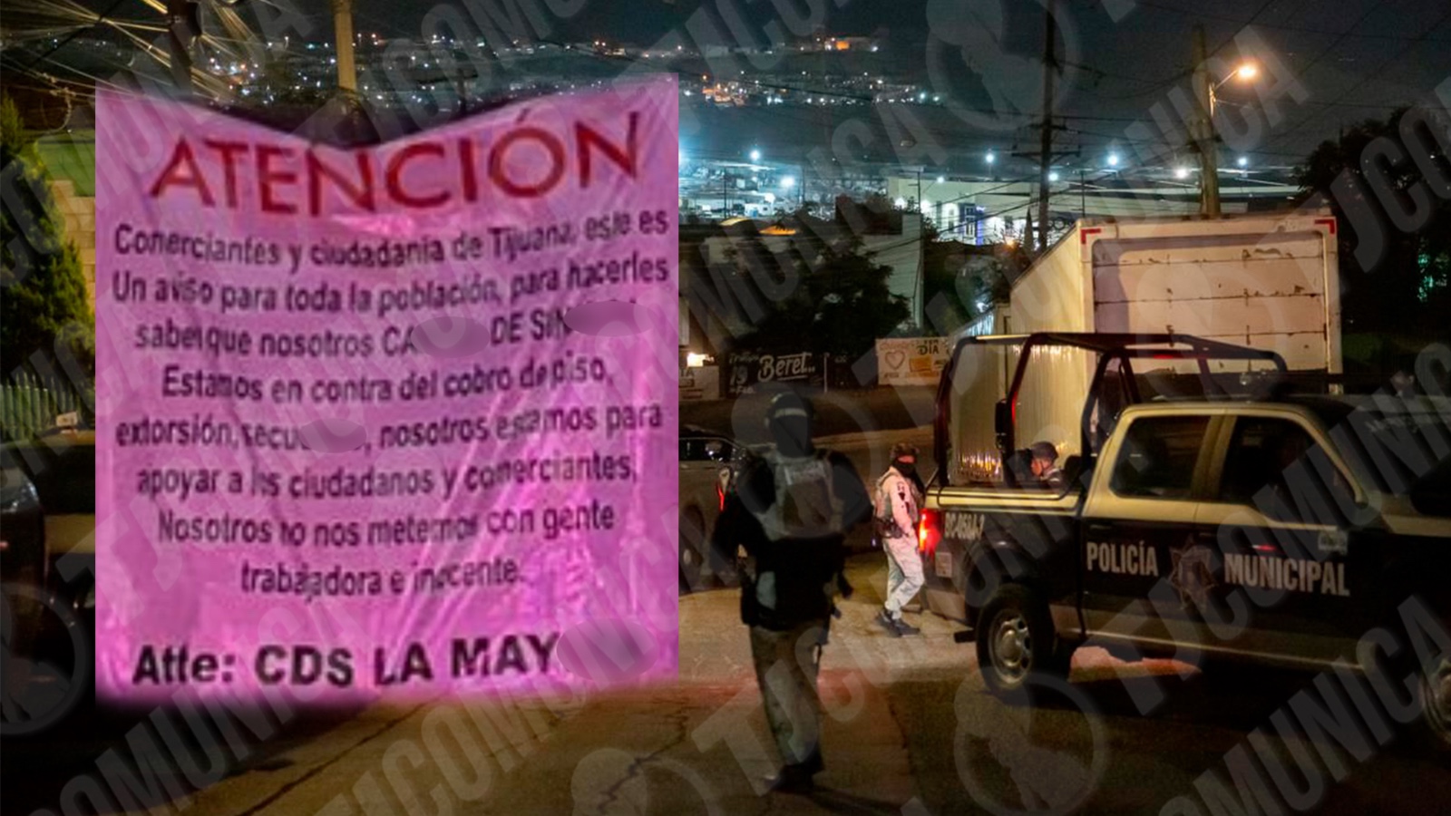 "ATENCIÓN comerciantes y ciudadanía de Tijuana: este es un aviso para toda la población, para hacerles saber que nosotros, CÁRTEL DE SINALOA, estamos en contra del cobro de piso, ext0rs1ón, s4cu4str0. Nosotros estamos para apoyar a los ciudadanos y comerciantes. No nos metemos con gente trabajadora e inocente. Atte: CDS LA MAYIZA”