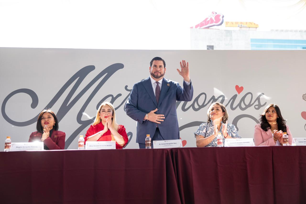 En la Zona Centro cientos de parejas dijeron “Sí, acepto” en un evento encabezado por el alcalde Ismael Burgueño, quien dirigió un mensaje a los recién casados, exhortándolos a mantener la comunicación, la tolerancia y el respeto mutuo a lo largo de su vida en común. El edil destacó la importancia de “amarse y quererse todos los días como si fuera el primero”, al recordarles el significado del compromiso adquirido.