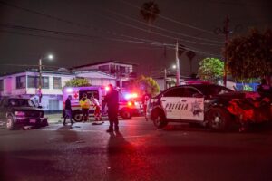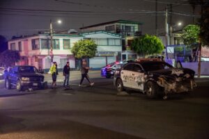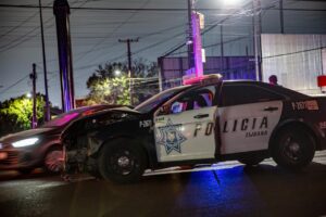 Una patrulla de la Policía Municipal y un vehículo tipo pick up chocaron en la Zona Centro durante la madrugada de este viernes.