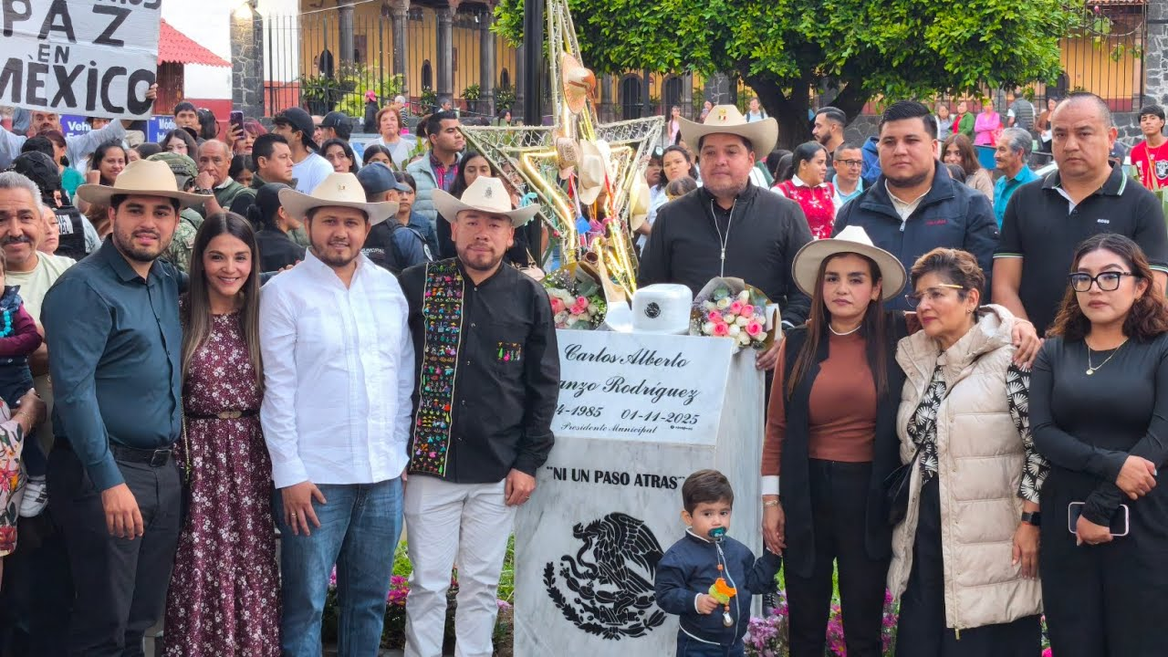 Develan placa y sombrero de mármol en memoria de Carlos Manzo
