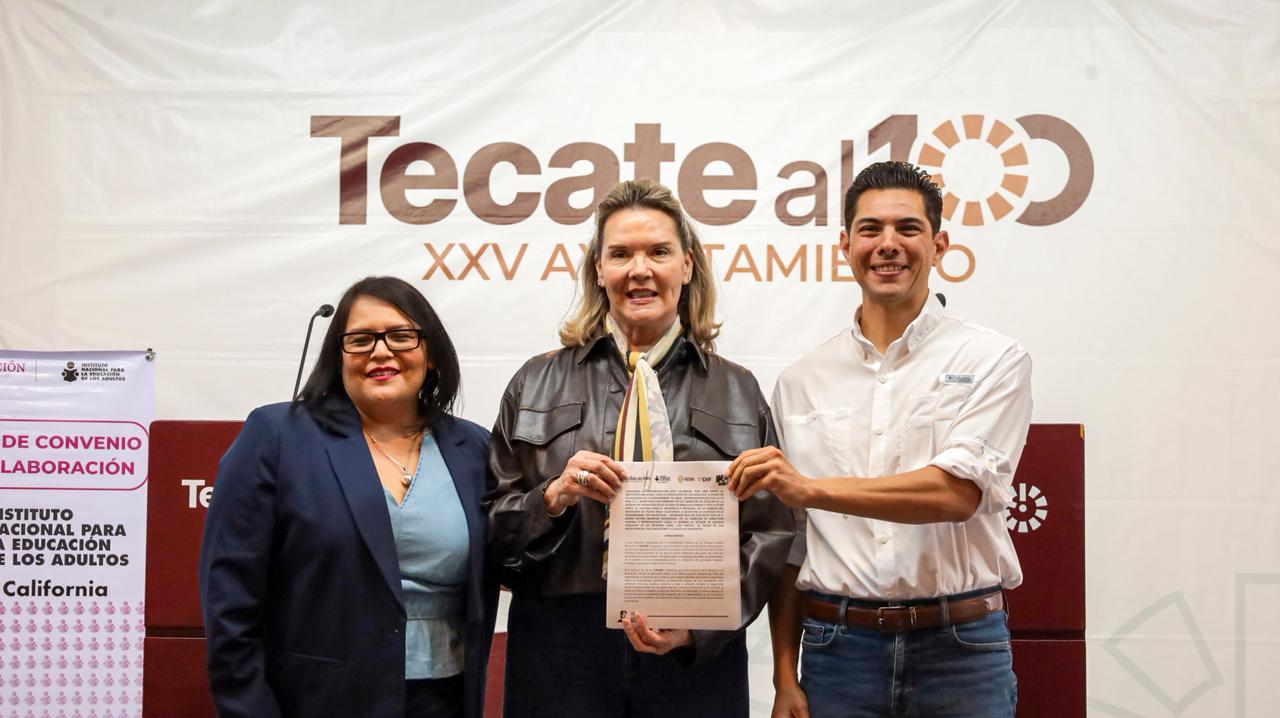 El acuerdo fue firmado por el alcalde de Tecate, Román Cota Muñoz; la titular de la Unidad de Operación del INEA en Baja California, Lic. Irene Walther Serrano; y la directora de DIF Municipal Tecate, L.D. María Esther Barbosa Rodríguez, quienes refrendaron su compromiso de trabajar de manera coordinada para acercar oportunidades educativas a la población.
