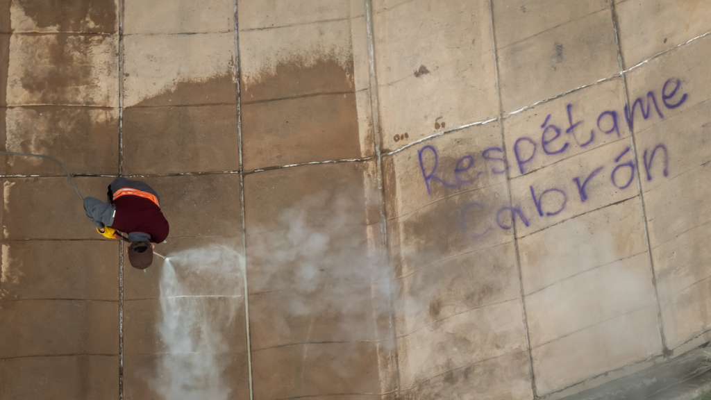 Según personal que participa en las labores, el proceso de limpieza inicia con la aplicación de un químico especial que ayuda a desprender la pintura de las superficies. Posteriormente, se utiliza una hidrolavadora con agua caliente a presión para eliminar los residuos.