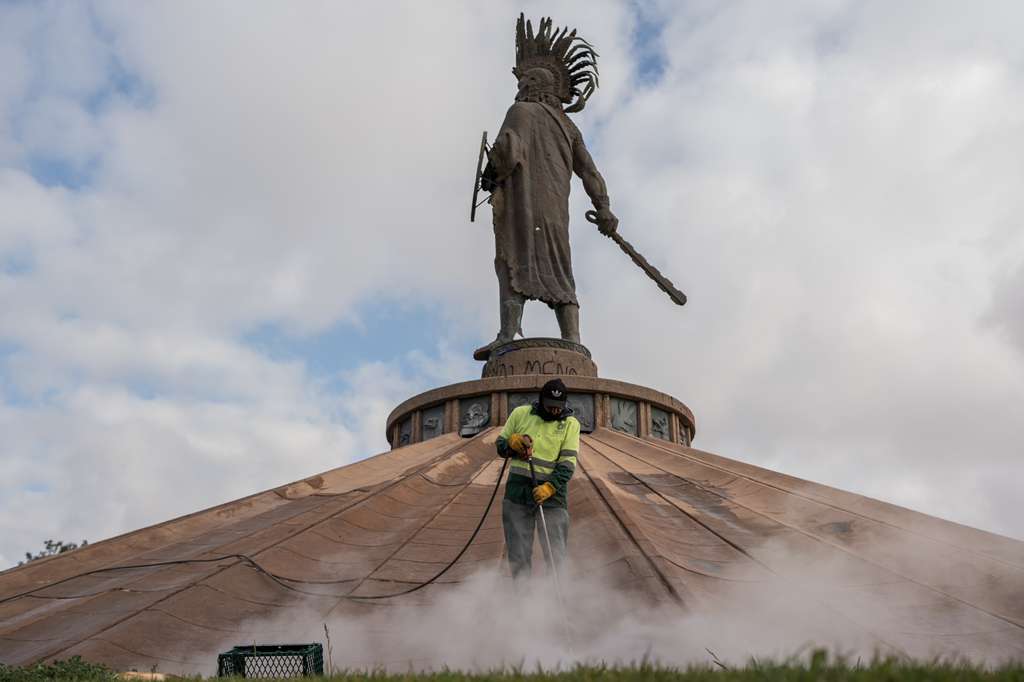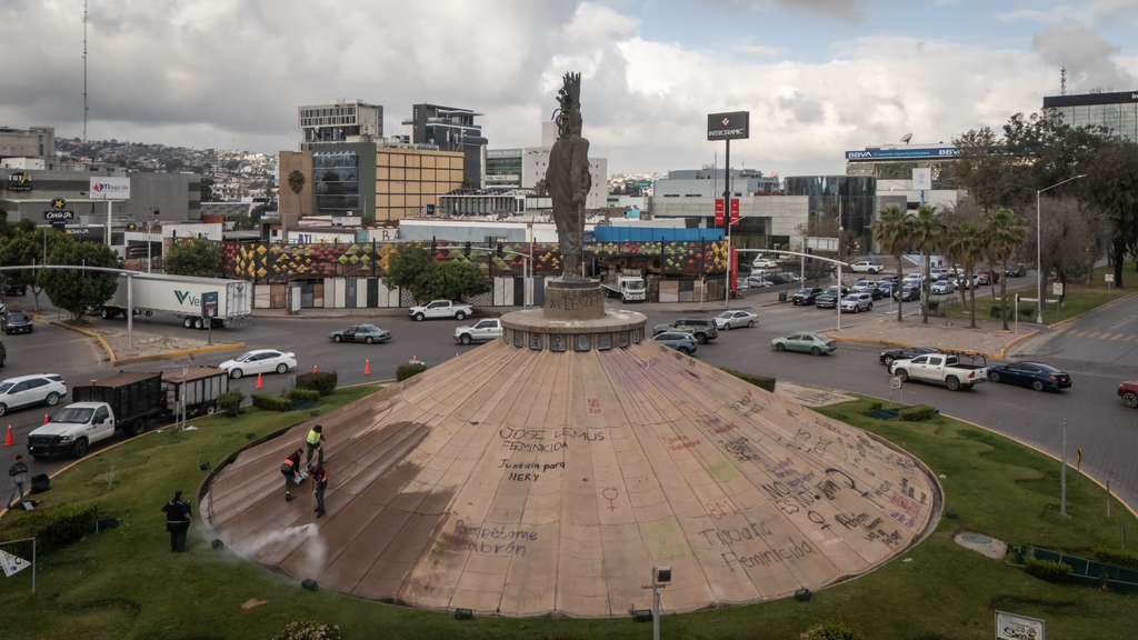 Desde la mañana de este martes, cuadrillas municipales comenzaron con la remoción de pintas en el monumento a Cuauhtémoc, uno de los espacios donde se realizaron intervenciones durante la movilización del pasado 8 de marzo.