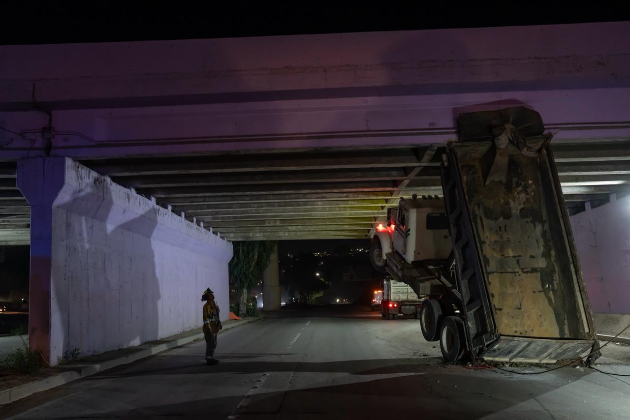 Un camión de volteo, presuntamente perteneciente a la maquinaria utilizada en las obras del viaducto, quedó atrapado en el puente que conecta la Avenida Internacional y la carretera a Playas de Tijuana durante la noche del jueves.