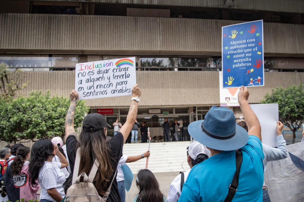 Durante la movilización, los participantes portaron pancartas con mensajes como “El futuro será inclusivo”, “La diversidad nos hace únicos, el respeto nos hace humanos” y “¿Los adultos que exigen que los niños regulen su conducta ya dominan la suya?”, en alusión a los constantes juicios sociales hacia menores con autismo.