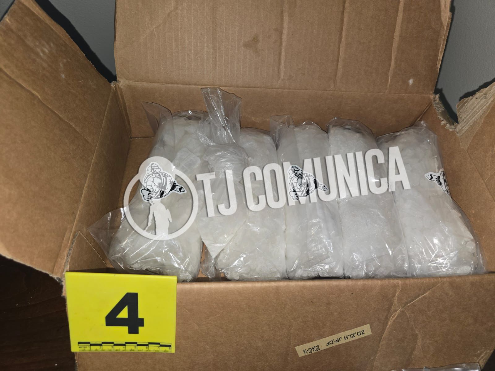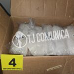 Asimismo, se decomisó una caja de cartón con cinco bolsas de plástico que contenían cr1st4l, cada una con un peso aproximado de una libra, las cuales tenían calcomanías alusivas a un apache.