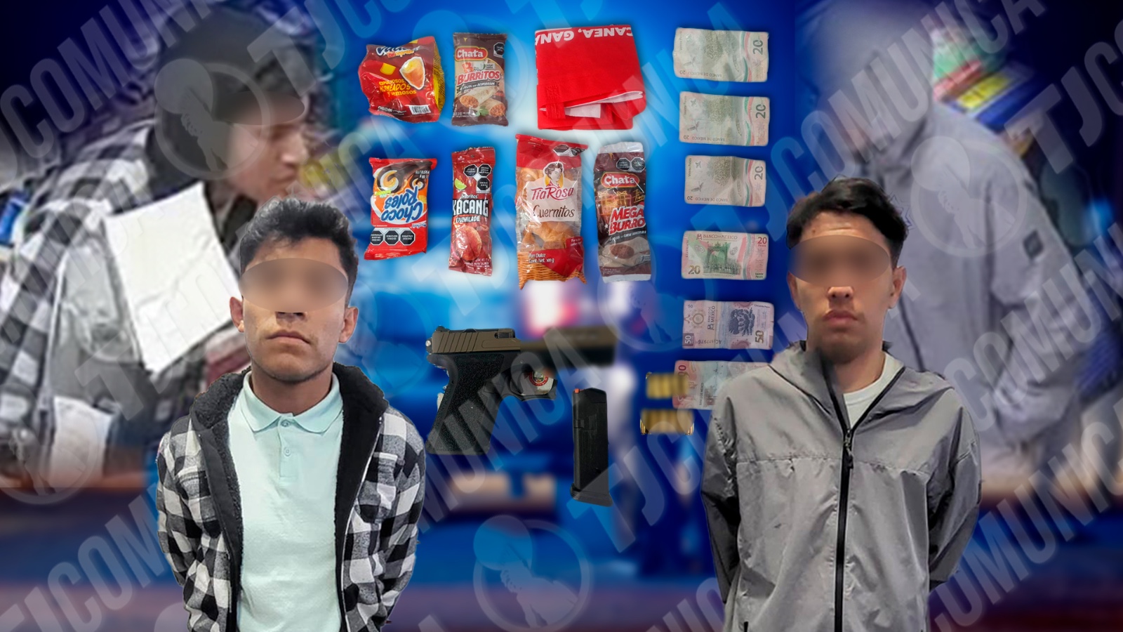 Los detenidos fueron identificados como Luis “N” originario de Sinaloa, y José “N” originario de Michoacán. Al primero se le aseguró un arma de fuego tipo pistola P-80 calibre 9 mm con un cargador y 11 cartuchos útiles. Al segundo se le localizó una bolsa roja con productos comestibles sustraídos de la tienda.