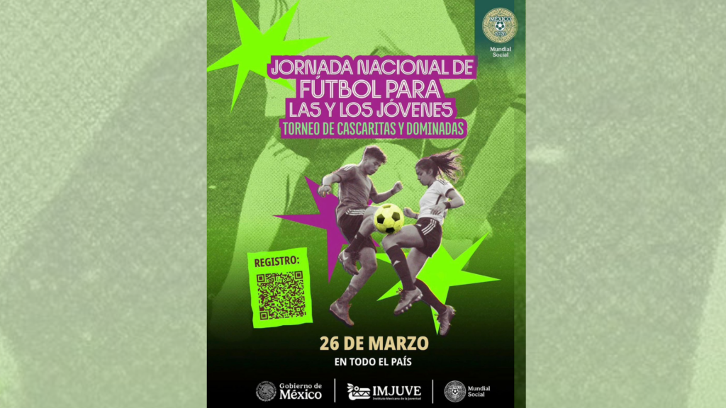 Este 26 de marzo, México va a jugar en equipo. Canchas, parques y espacios deportivos de todo el país se llenarán de vida con la Jornada Nacional de Fútbol para las y los Jóvenes: Torneo de Cascaritas y Dominadas, una convocatoria del Gobierno de México, a través del Instituto Mexicano de la Juventud, para hacer del fútbol un punto de encuentro, comunidad y transformación.