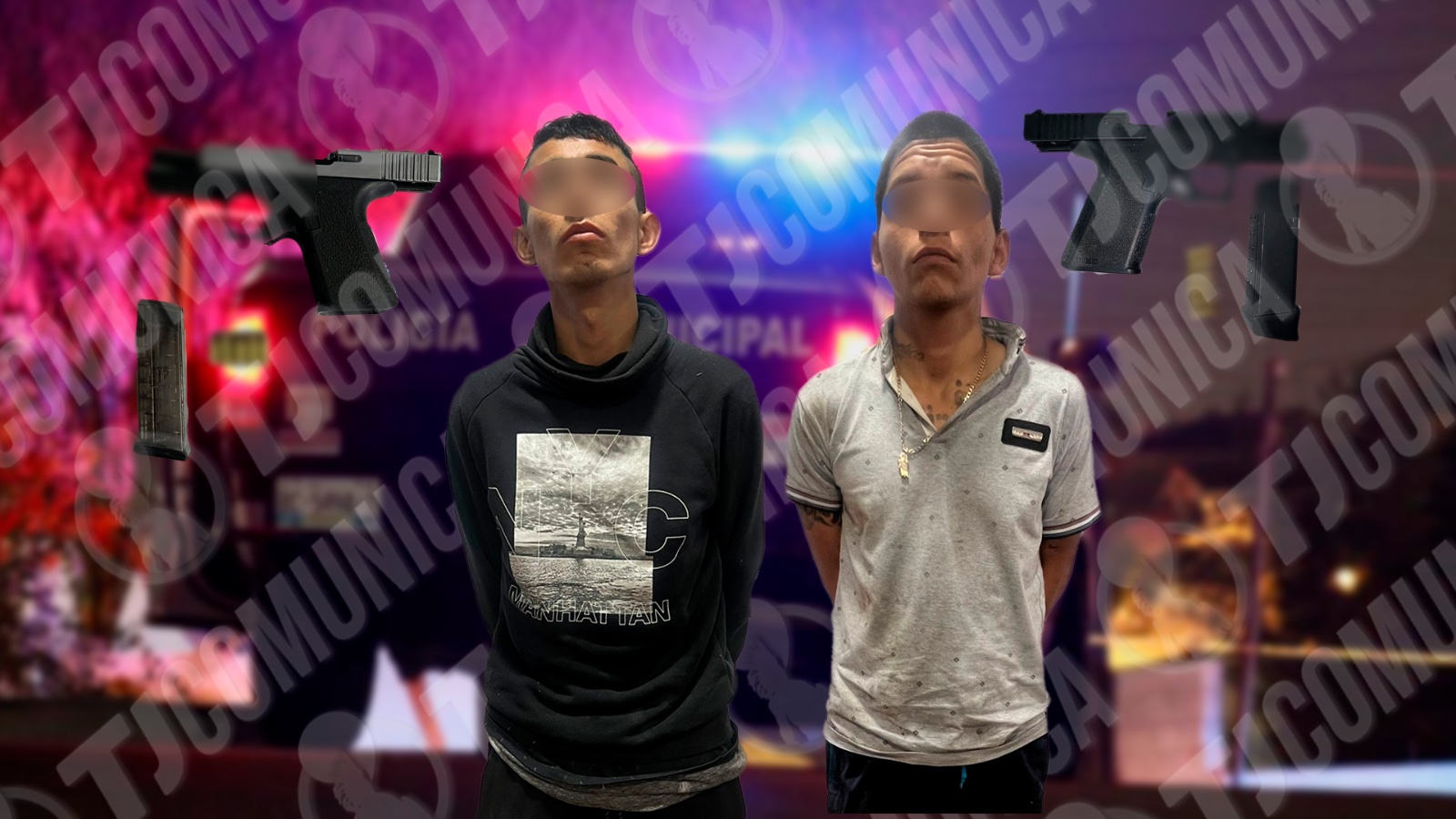 Elementos de la policía municipal de Tijuana detuvieron a dos hombres que portaban armas de fuego sobre la calle 3 y Guadalupe Victoria, en la colonia Lomas de la Amistad.
