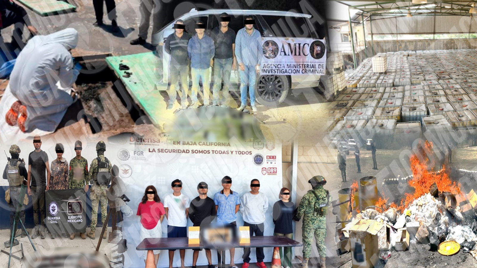 En tres eventos distintos en Baja California, se detuvieron a 10 personas, asegurando tres armas cortas, cargadores, 530 cartuchos, diversas dosis de sustancias ilícitas y vehículos. A su vez, en Chihuahua, en el interior de un vehículo, se localizó un arma larga, 11.4 kilos de f3nt4n1lo y 82.5 kilos de m*rihu*n*, con un costo total de 40.7 millones de pesos.