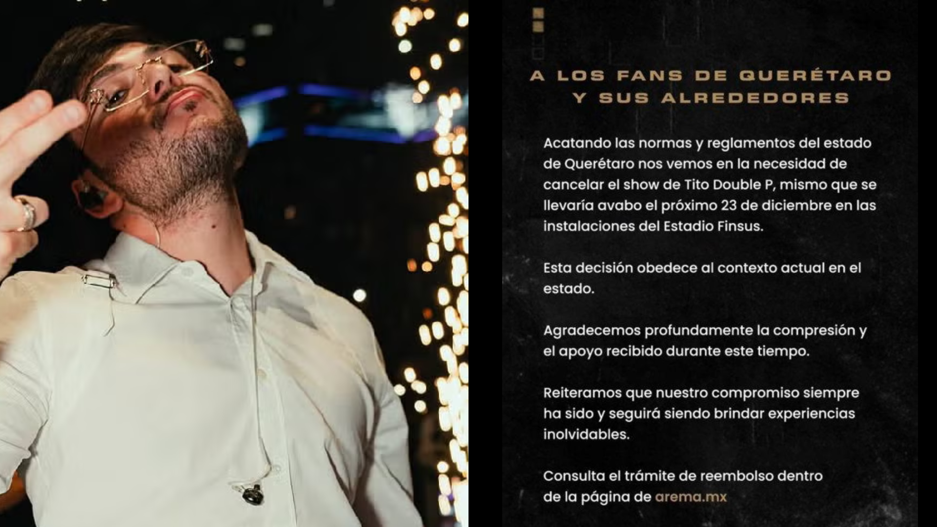 “Acatando las normas y reglamentos del estado de Querétaro, nos vemos en la necesidad de cancelar el show de Tito Double P (…) Esta decisión obedece al contexto actual en el estado. Agradecemos profundamente la comprensión y el apoyo recibido durante este tiempo. Reiteramos que nuestro compromiso siempre ha sido y seguirá siendo brindar experiencias inolvidables”, se lee en el comunicado.