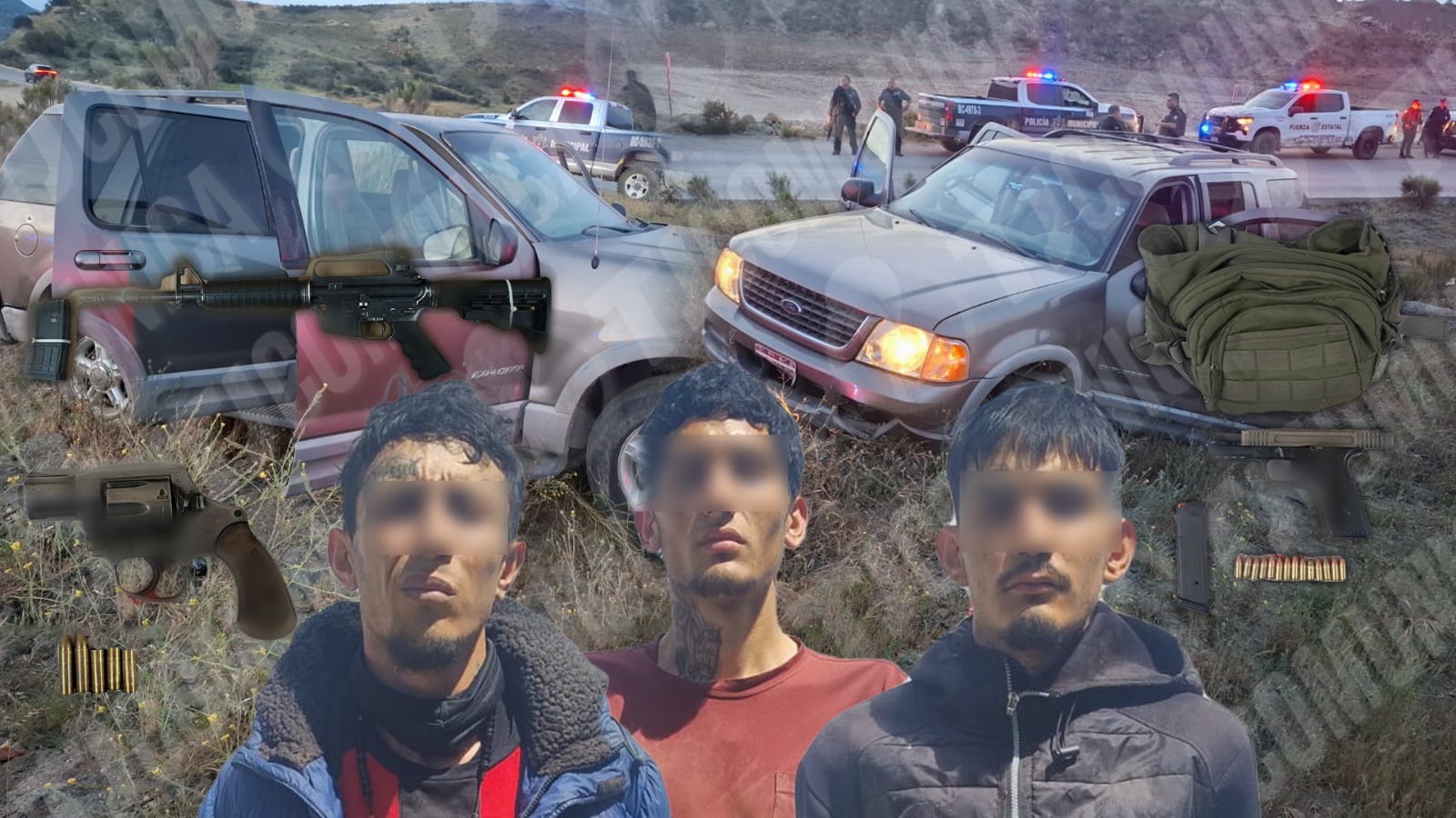 Al aproximarse al lugar, observaron a varios sujetos 4rmados que abordaban una camioneta tipo vagoneta color verde olivo, iniciando una persecución que se extendió hasta el bulevar 2000. Durante la huida, los sospechosos abandonaron el vehículo, lo que derivó en una persecución a pie que culminó con la detención de tres hombres