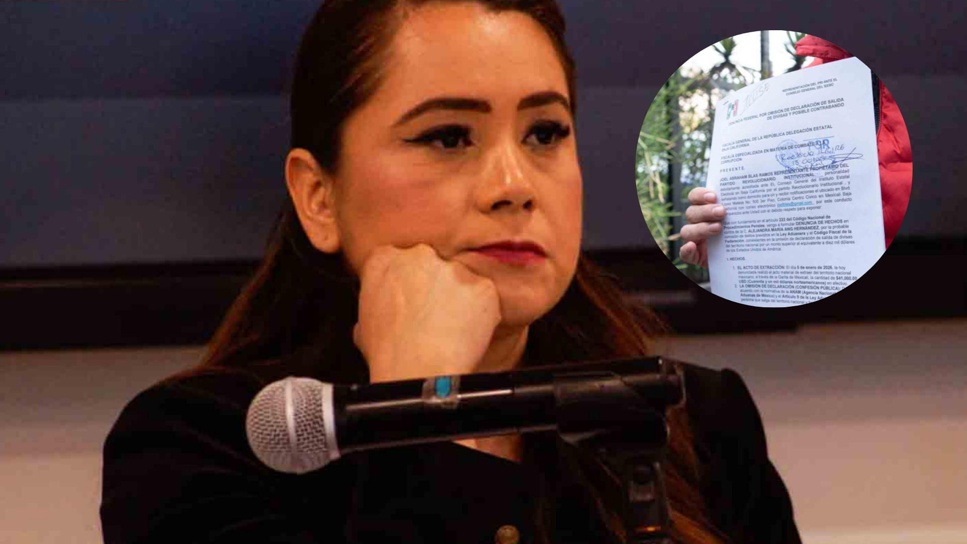 La denuncia fue presentada ante la Fiscalía Especializada en materia de Combate a la Corrupción, días después del lunes 5 de enero, fecha en la que la diputada morenista Alejandra Ang Hernández fue detenida por agentes de la CBP en la garita Mexicali–Calexico, para posteriormente ser liberada.