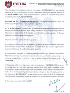 El contrato contiene una cláusula para la terminación anticipada, sin embargo, a pesar de que el servicio entregado no logró funcionar en ningún momento e incluso atrasaron los plazos de entrega, el XXIV Ayuntamiento decidió no rescindirlo. Aunque la administración de Montserrat hubiera cancelado el contrato, no se estipula que la MTI regrese el dinero, en cambio, se señala que Tijuana pagaría los gastos no recuperables que la empresa privada hubiera hecho. ¿Por qué se firmaría un contrato donde la administración se obliga a pagar algo que no funciona?